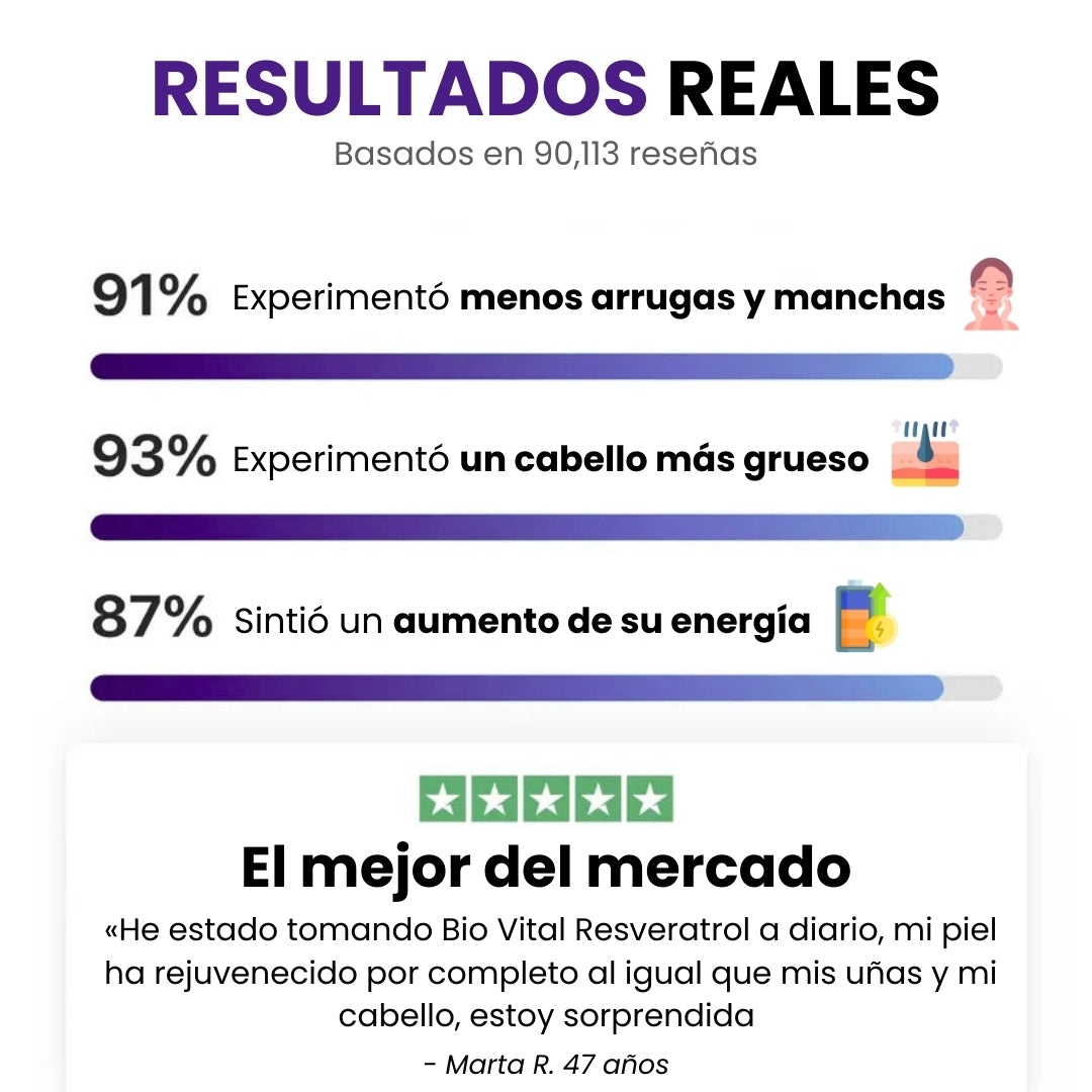 BioVital® Resveratrol Premium contiene 1800mg de resveratrol trans puro con absorción del 95%, activando tus genes de longevidad y provocando una regeneración celular profunda visible en solo 14 días:
